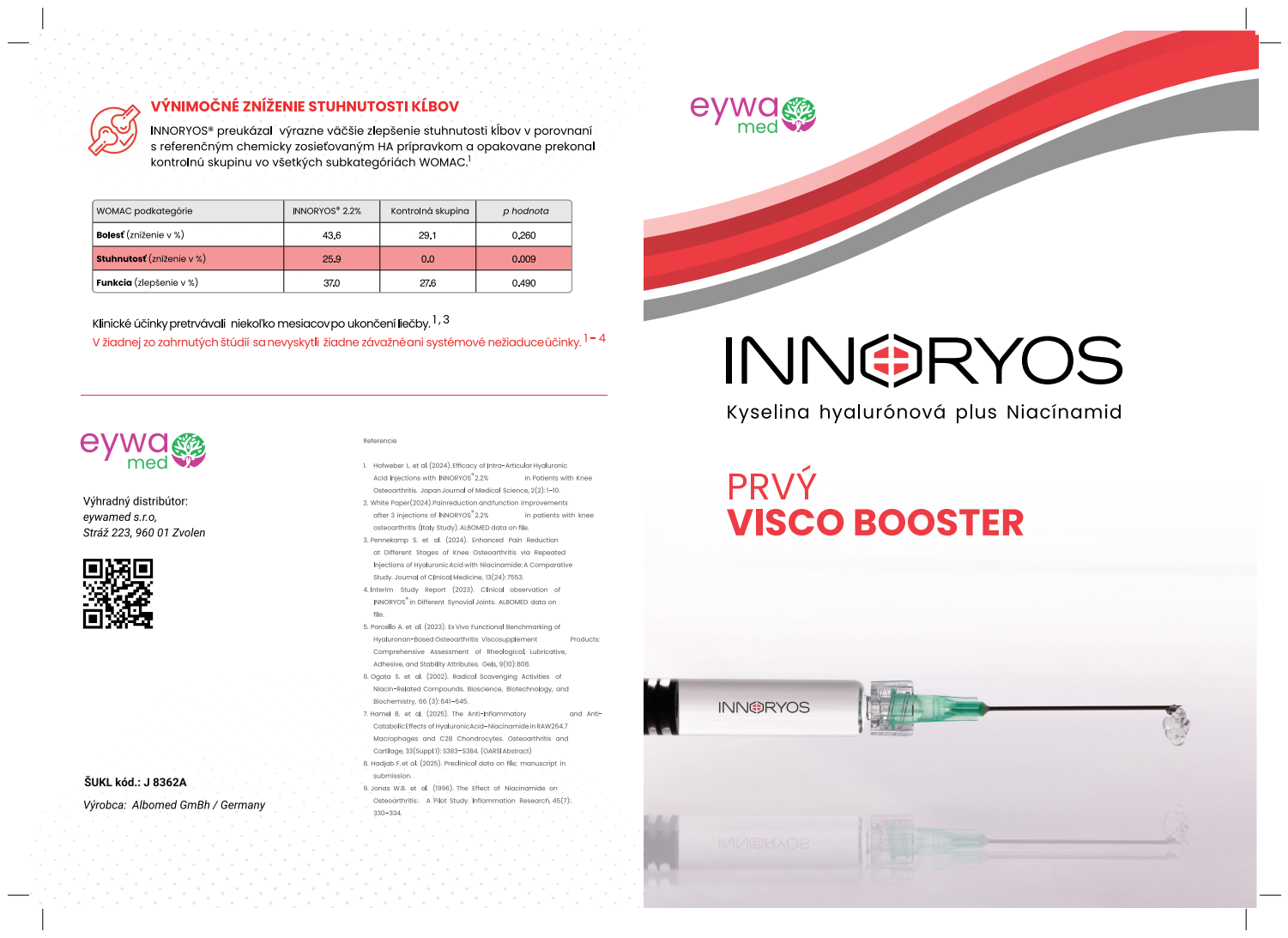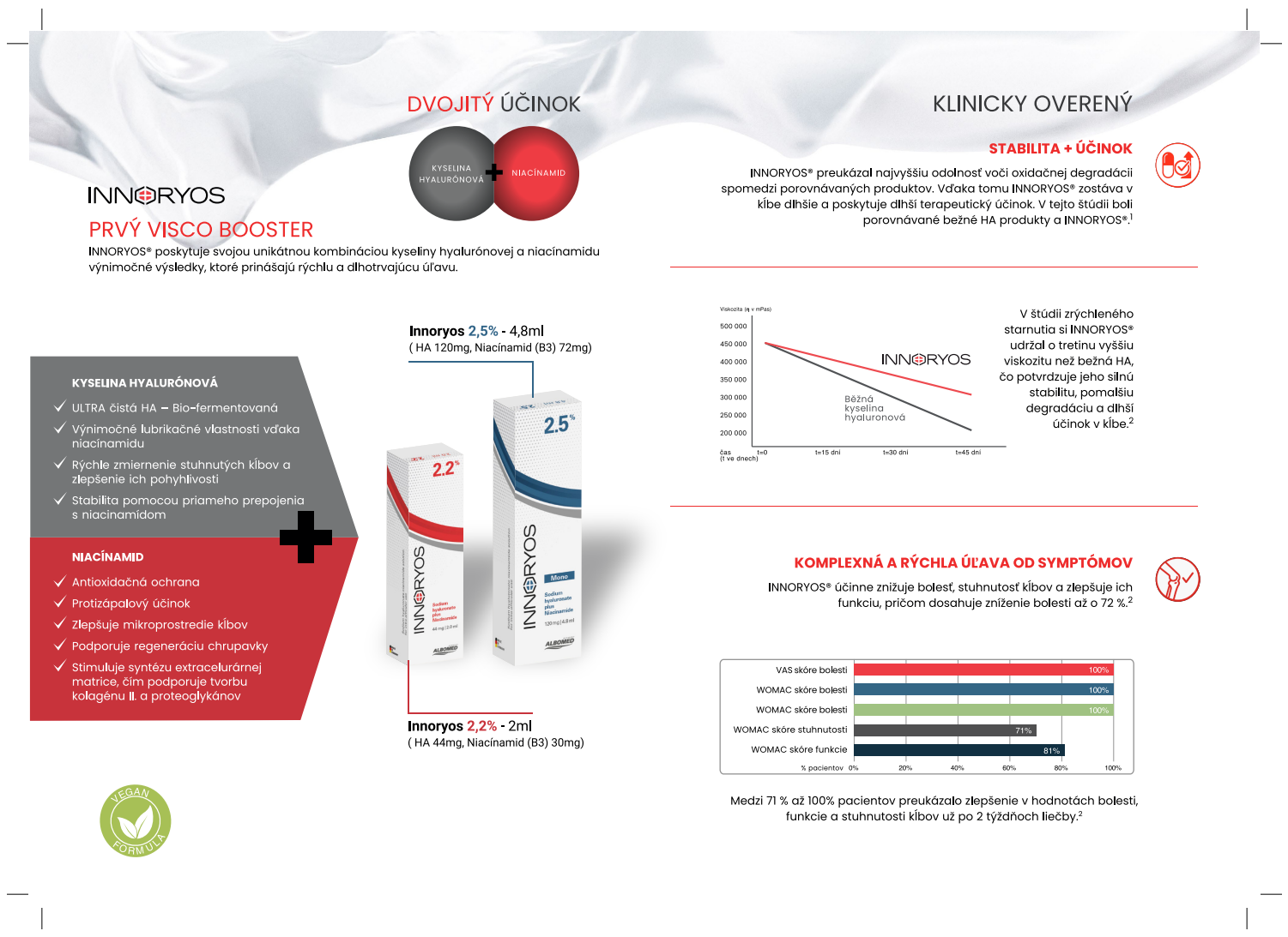 INNORYOS je moderný visko-booster určený na intraartikulárnu aplikáciu. Kombinuje kyselinu hyalurónovú a niacínamid (vitamín B3) s cieľom zmierniť bolesť, znížiť stuhnutosť a zlepšiť pohyblivosť kĺbov. Klinicky hodnotená zdravotnícka pomôcka.
